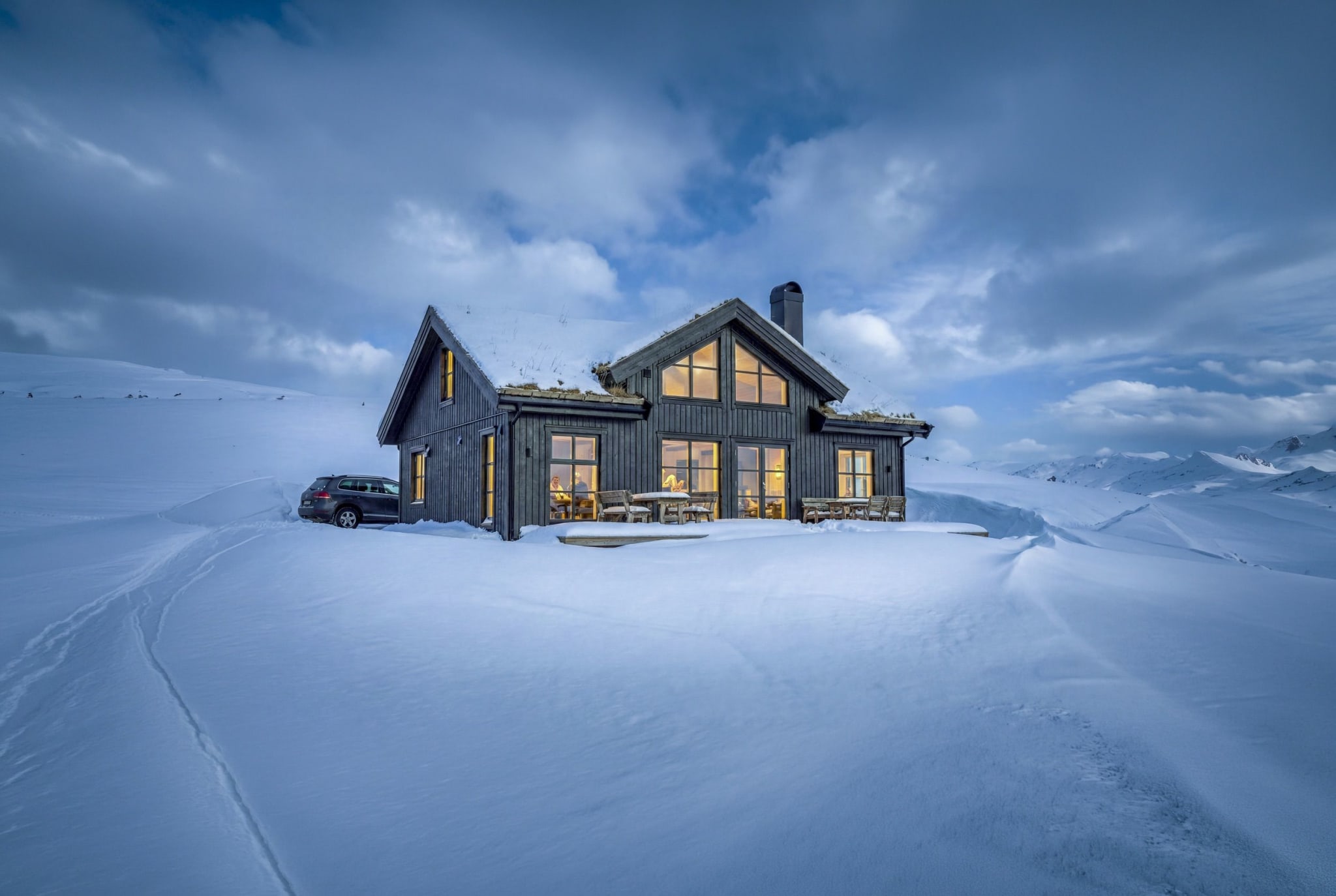 Lofoten 76 har et åpent stue-og kjøkkenareal langs fasaden av hytta med plasstil både langbord og sofagruppe med god utsikt til omgivelsene. Med romslig hemsstue på 21,6 m2 har familiensyngste mulighet til å trekke seg tilbake for egne aktiviteter,