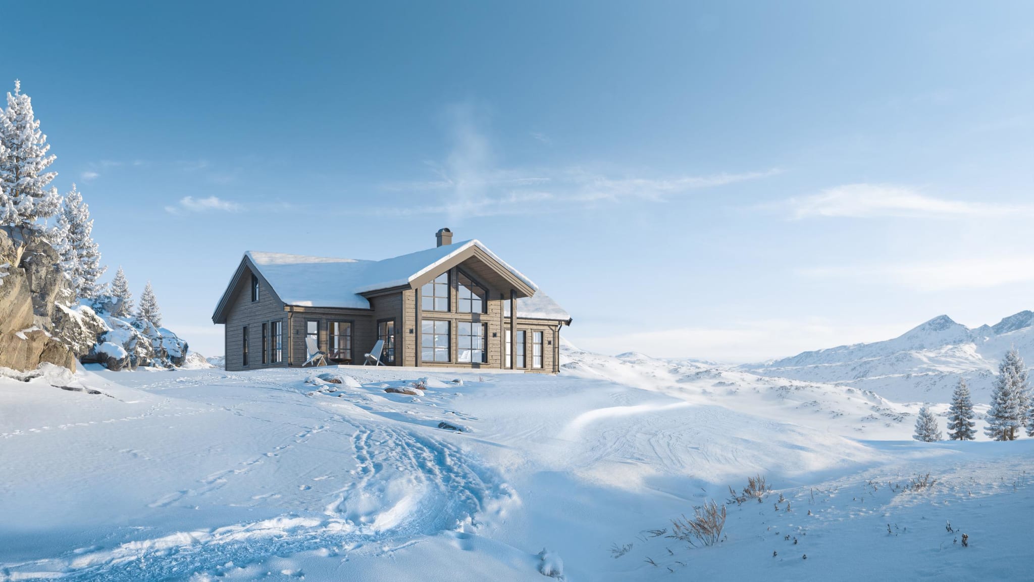 Vår populære hytteserie Polar med sitt fremskutte midtparti er den perfekte hytta for utsiktsstomtene. I denne hytta får du full utnyttelse av naturen med panoramavinduer i tre himmelretninger og to lune uteplasser på hver side, tilpasset skiftende vær - og vindforhold.