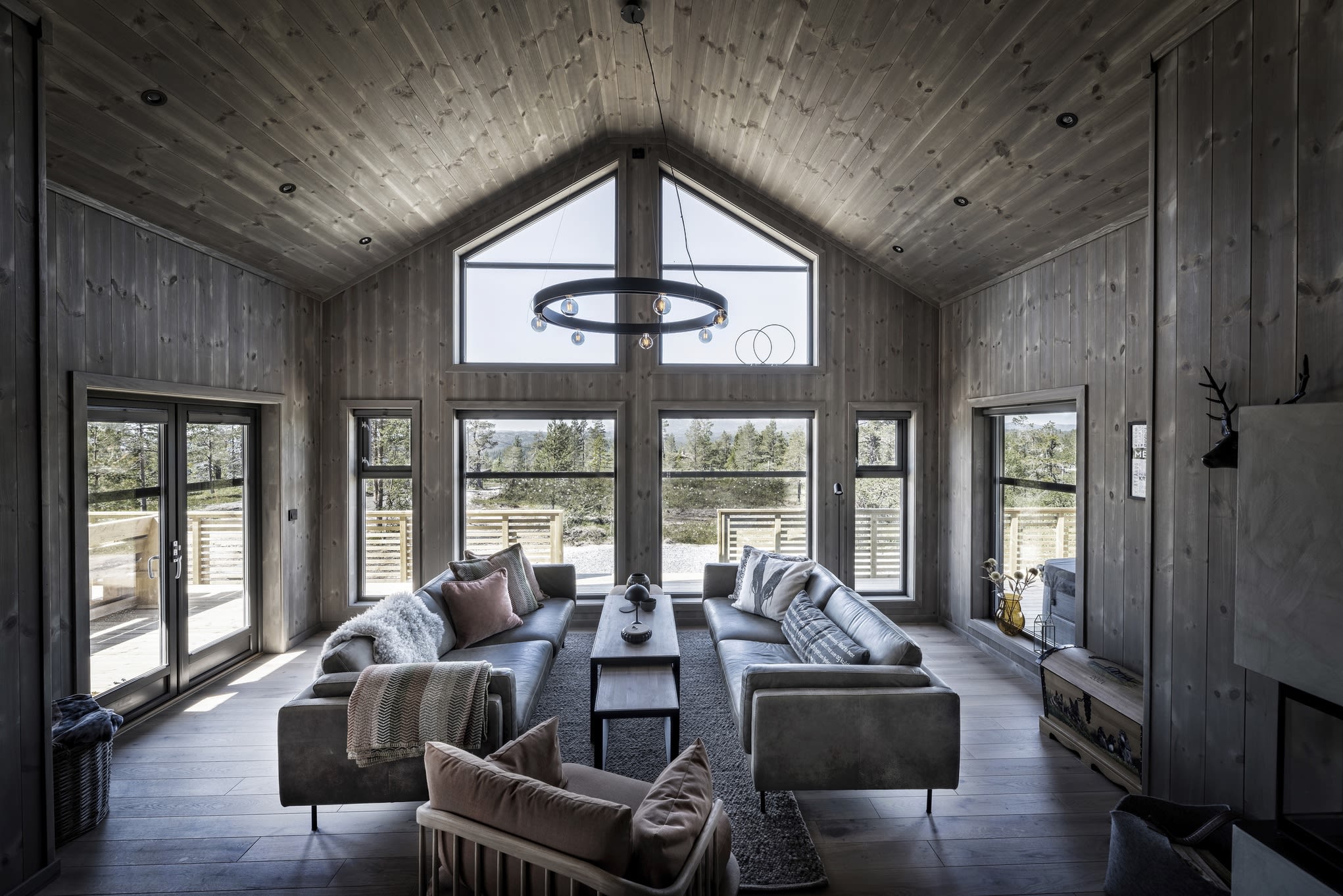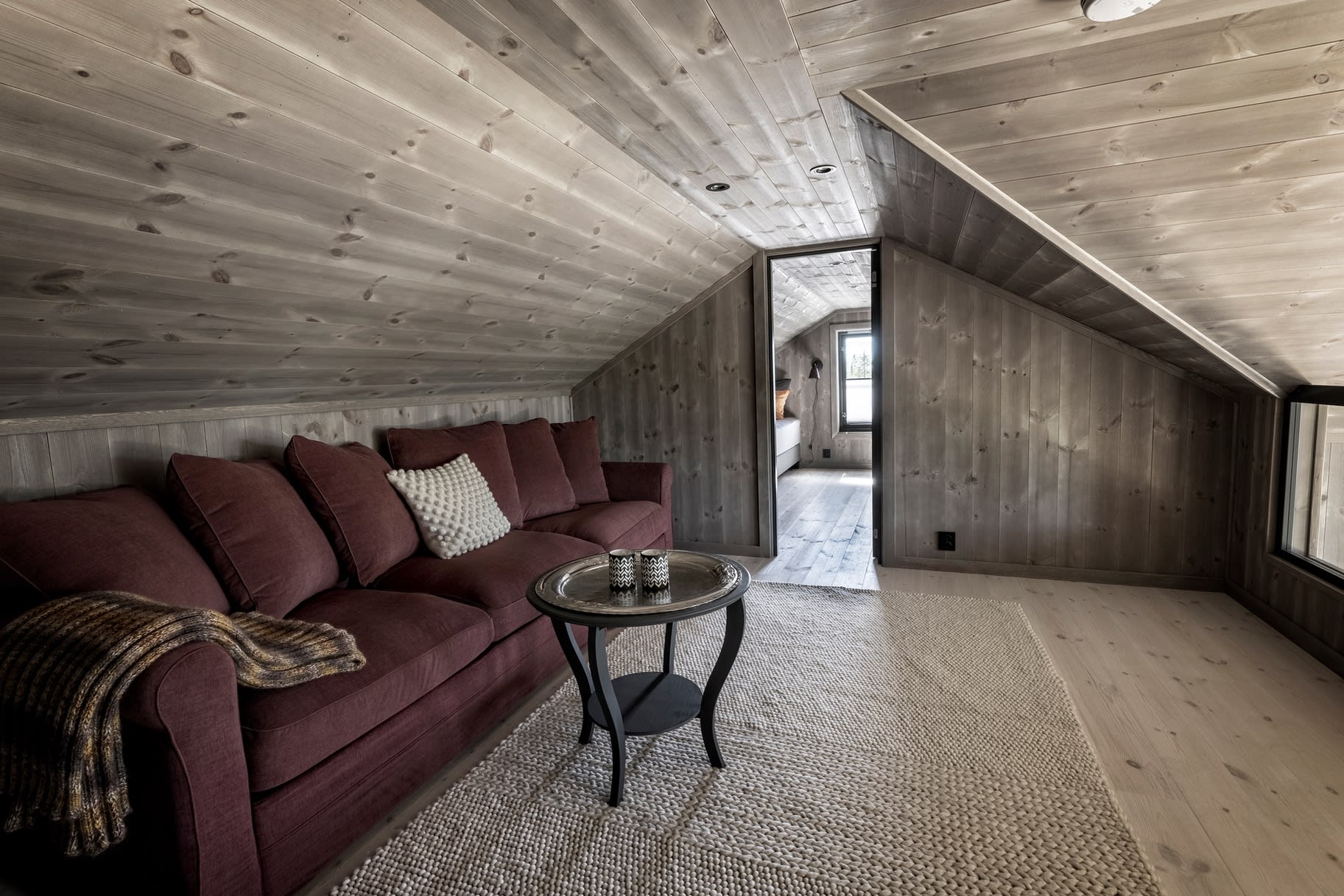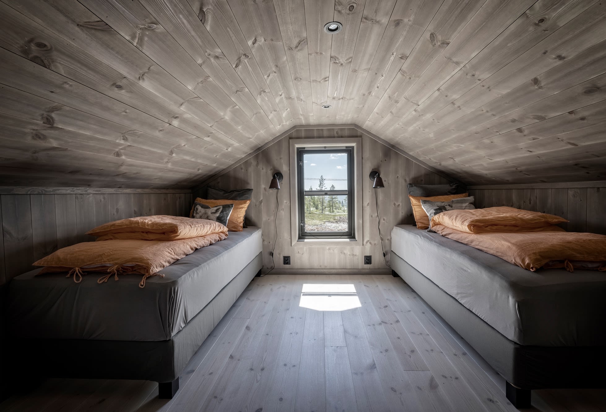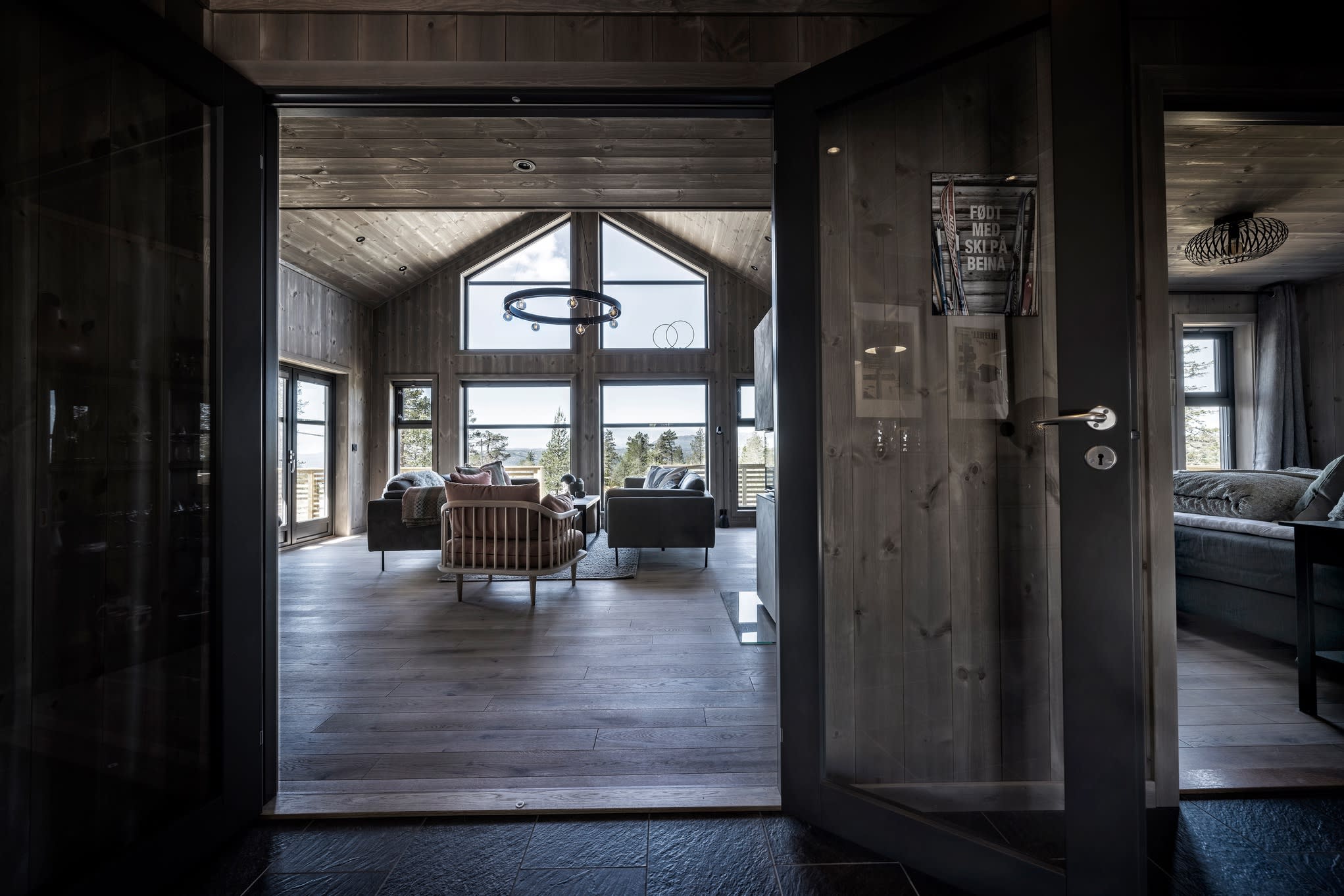 Her har kunden valgt en Max modell av Polar 110 for å få en større stuedel. I tillegg ble det tegnet inn et ekstra baderom. Hytta ble speilvendt for å tilpasses utsiktsretningen på tomten, og det er satt inn et ekstra skråvindu på et av hemserommene for å få bedre utsyn herfra. Fargevalg: Furu slettpanel på vegg og tak i fargen Myk eleganse, heltre eikegulv i fargen Artic.