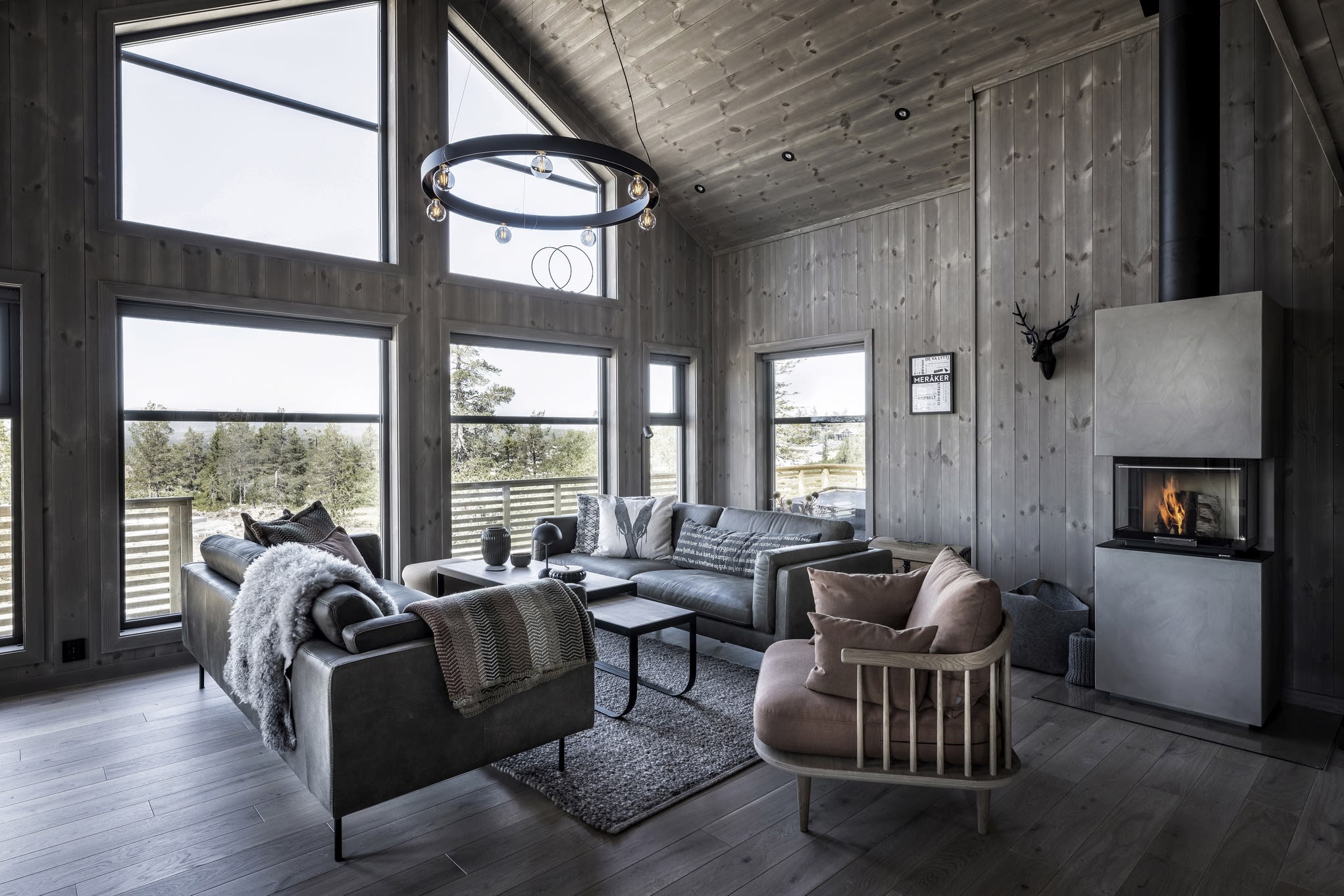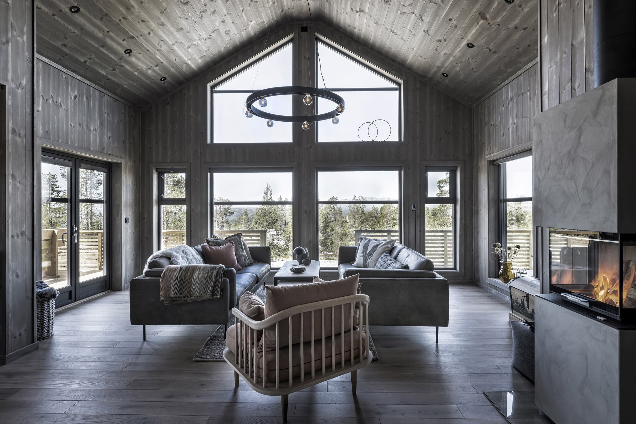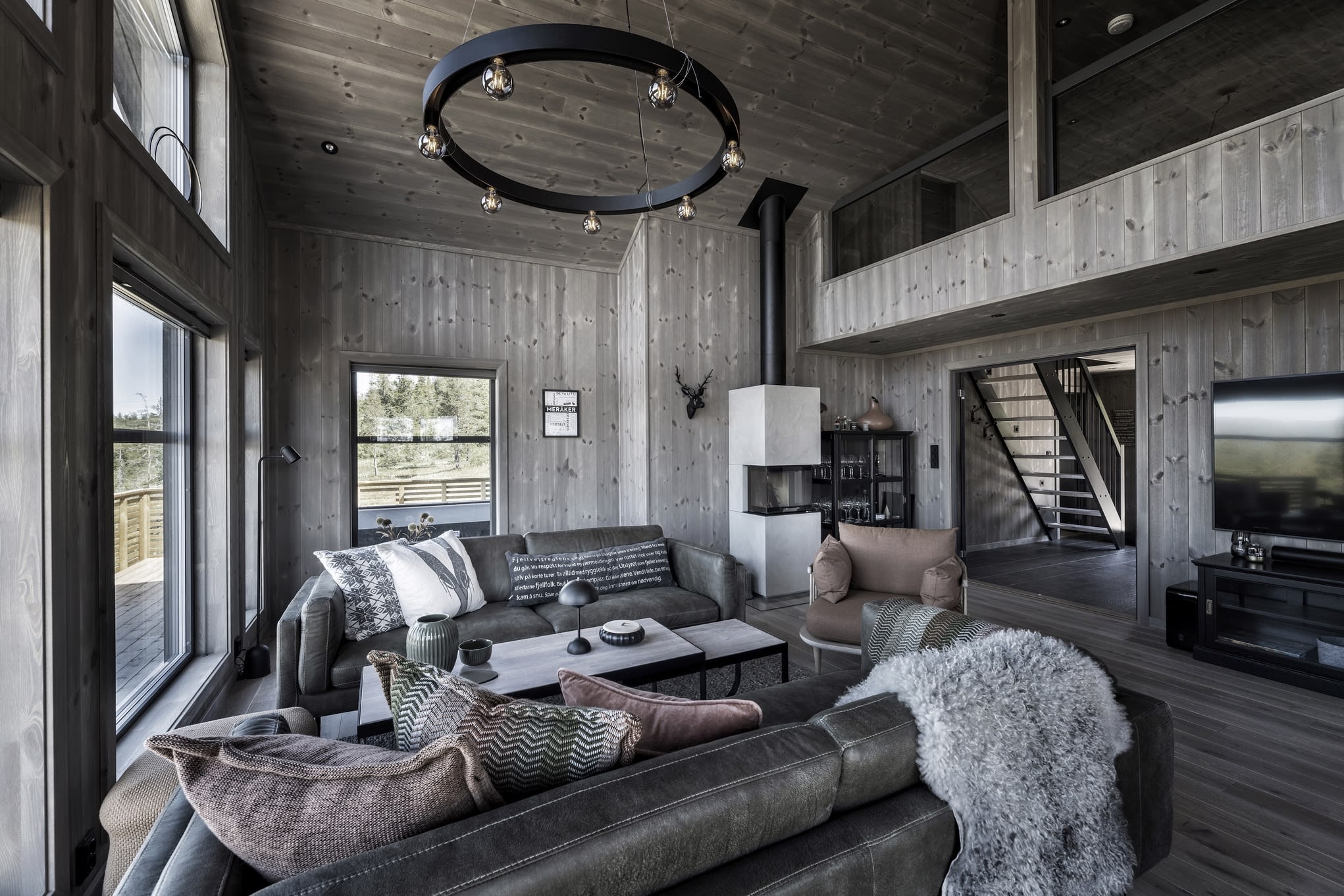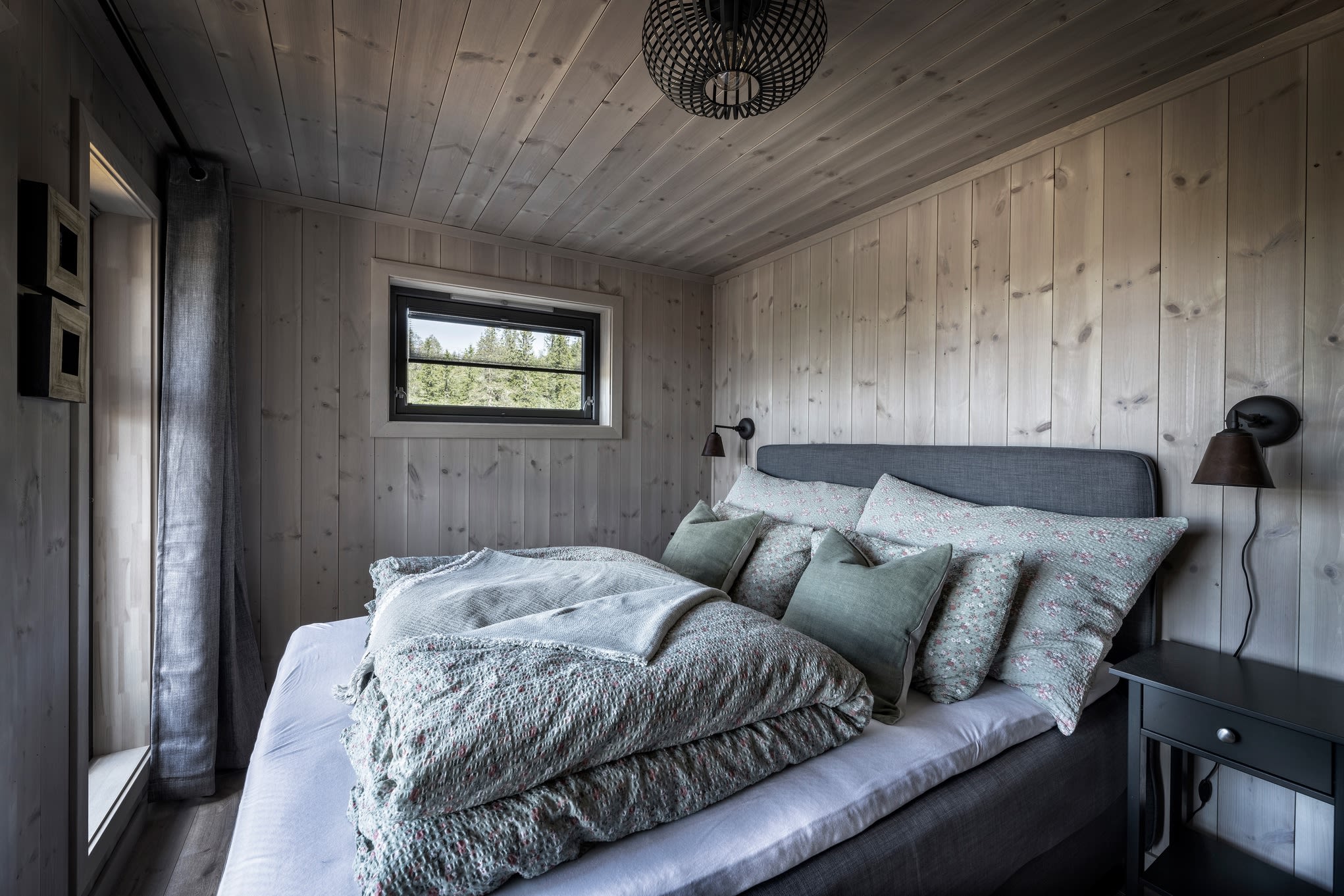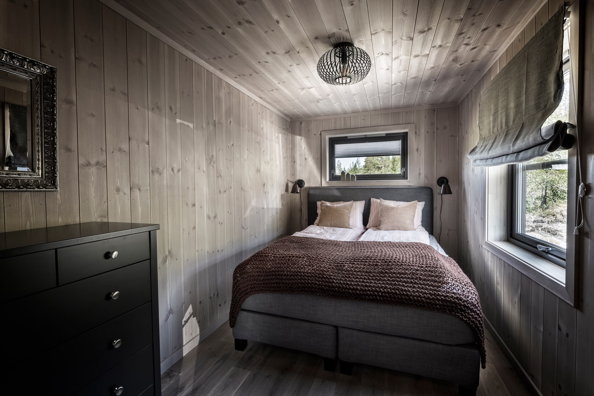 Her har kunden valgt en Max modell av Polar 110 for å få en større stuedel. I tillegg ble det tegnet inn et ekstra baderom. Hytta ble speilvendt for å tilpasses utsiktsretningen på tomten, og det er satt inn et ekstra skråvindu på et av hemserommene for å få bedre utsyn herfra. Fargevalg: Furu slettpanel på vegg og tak i fargen Myk eleganse, heltre eikegulv i fargen Artic.