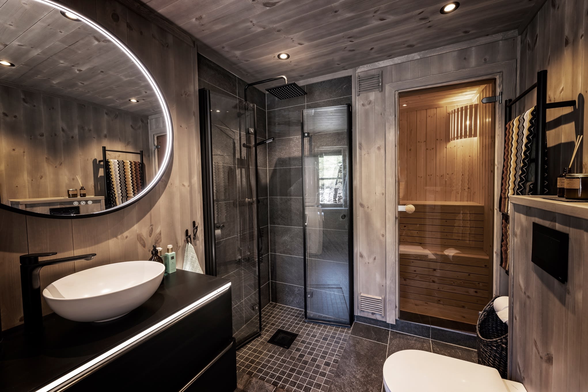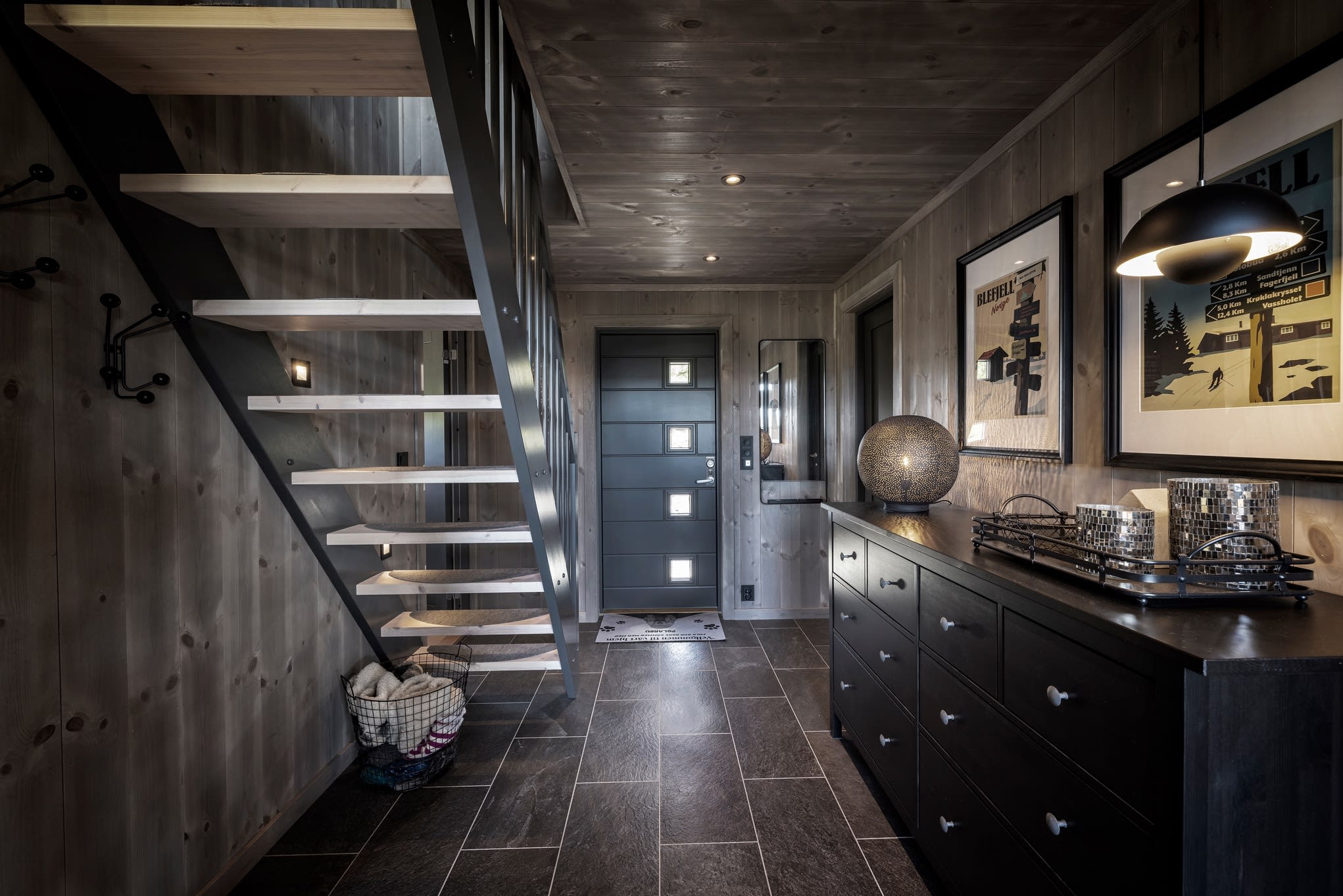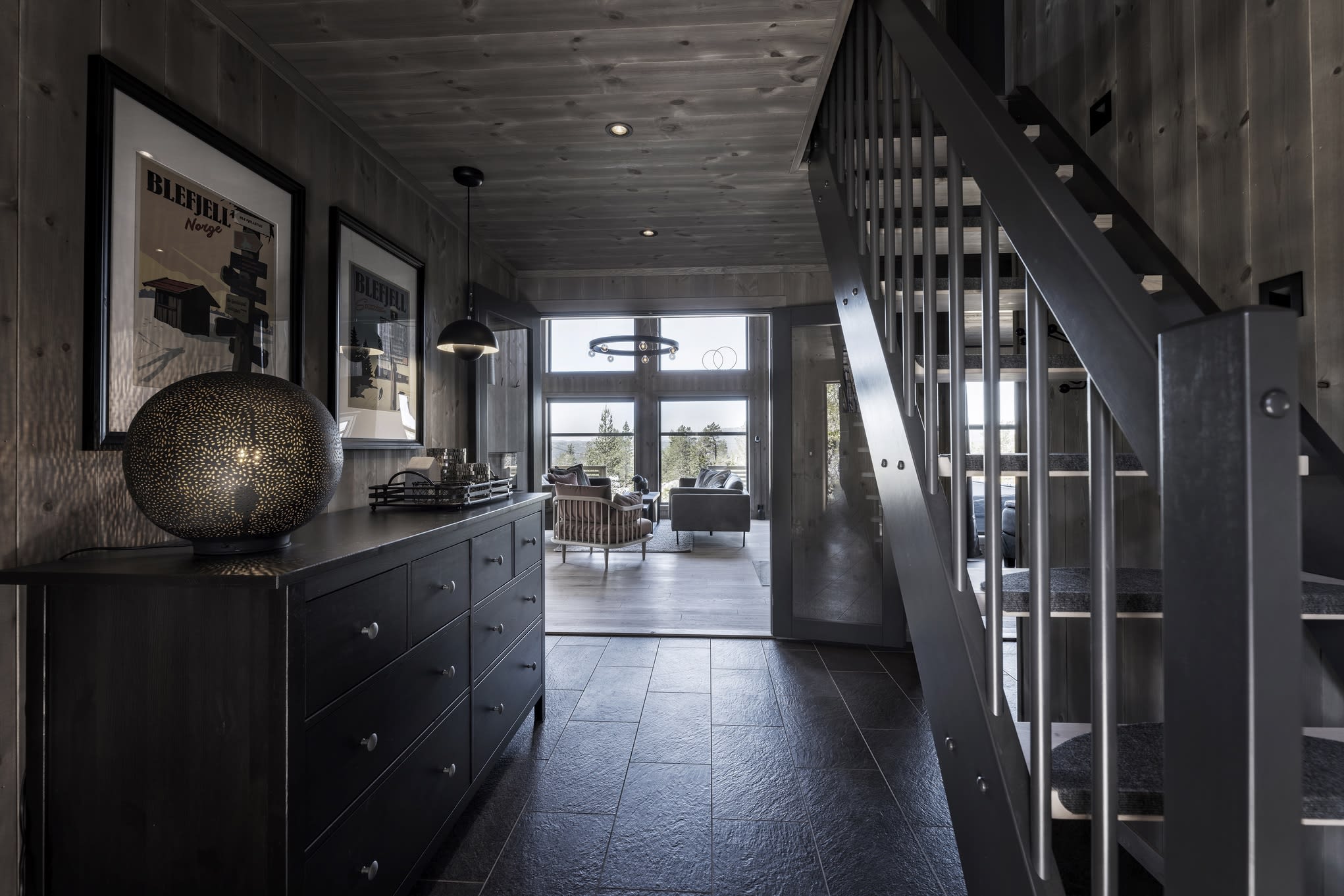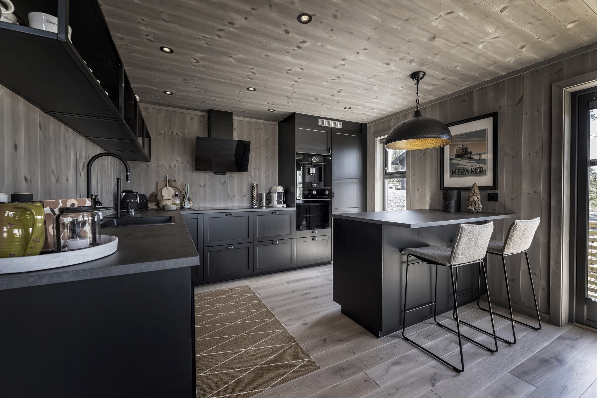 Her har kunden valgt en Max modell av Polar 110 for å få en større stuedel. I tillegg ble det tegnet inn et ekstra baderom. Hytta ble speilvendt for å tilpasses utsiktsretningen på tomten, og det er satt inn et ekstra skråvindu på et av hemserommene for å få bedre utsyn herfra. Fargevalg: Furu slettpanel på vegg og tak i fargen Myk eleganse, heltre eikegulv i fargen Artic.